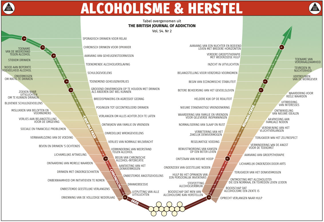 Tabel van het alcoholisme en van het herstel: de “Jellinek curve”